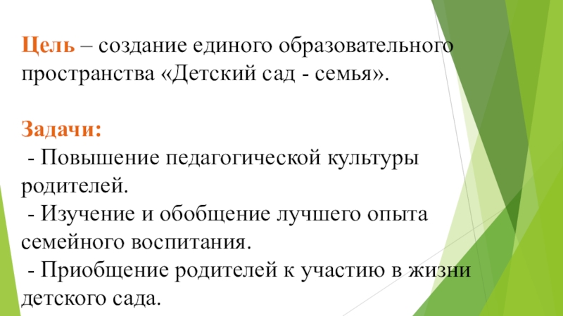 Цель – создание единого образовательного пространства «Детский сад - семья».  Задачи:  - Повышение педагогической