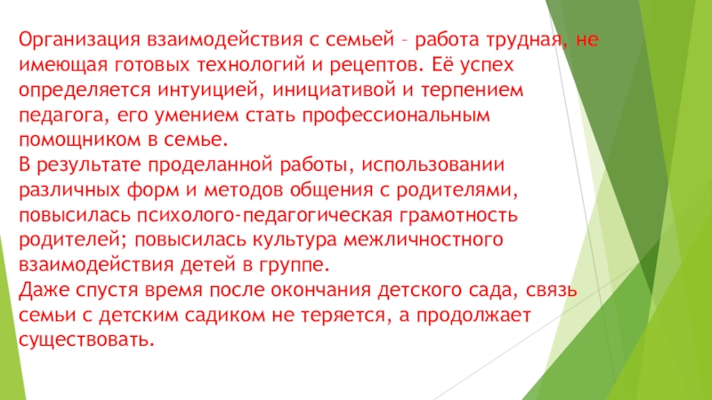 Слайд 26Организация взаимодействия с семьей – работа трудная, не имеющая готовых технологий