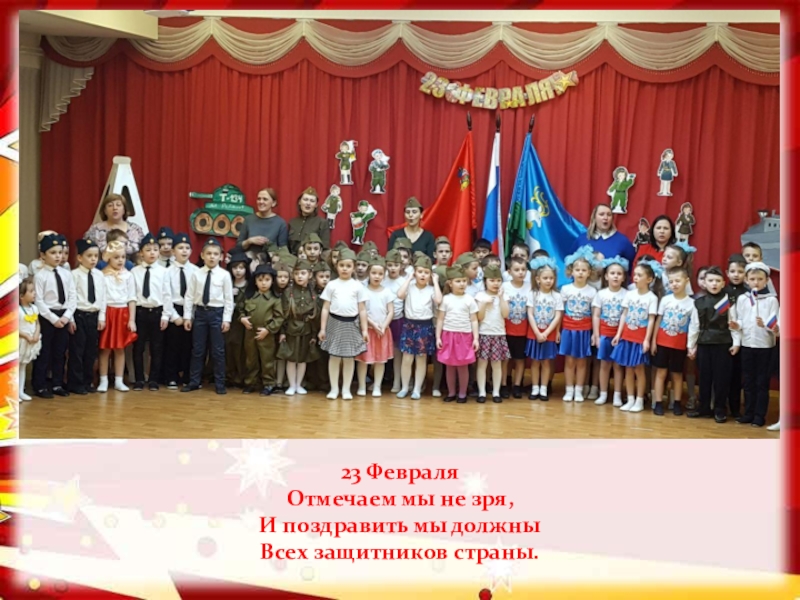 23 Февраля Отмечаем мы не зря, И поздравить мы должны Всех защитников страны.