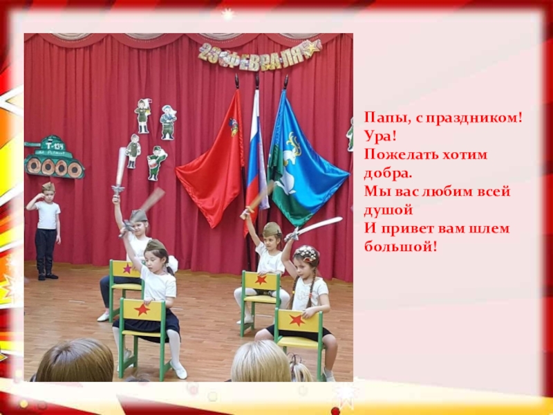 Папы, с праздником! Ура! Пожелать хотим добра. Мы вас любим всей душой И привет вам шлем большой!