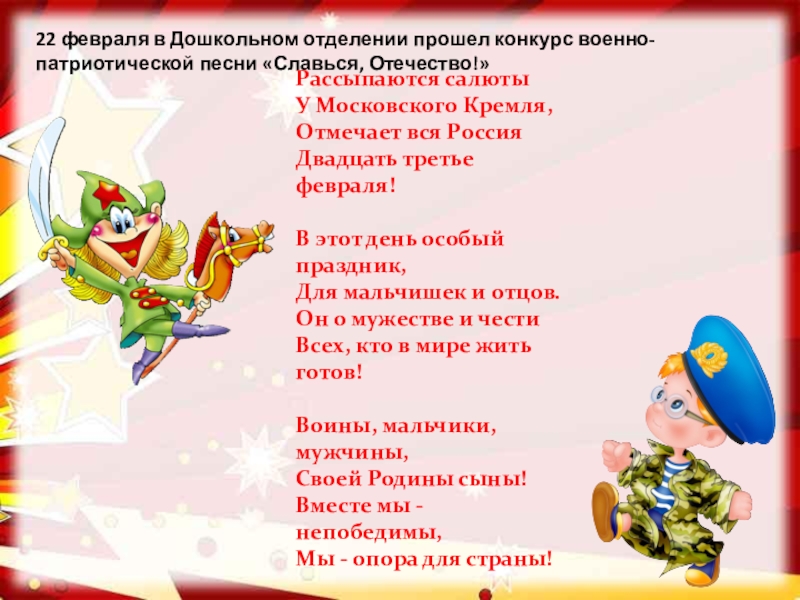 Слайд 222 февраля в Дошкольном отделении прошел конкурс военно-патриотической песни «Славься, Отечество!»
