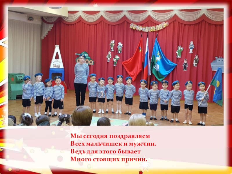 Мы сегодня поздравляем Всех мальчишек и мужчин. Ведь для этого бывает Много стоящих причин.