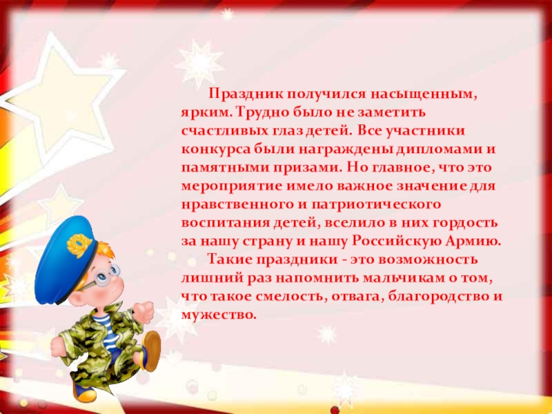Такие праздники - это возможность лишний раз напомнить мальчикам о том, что такое смелость, отвага, благородство и мужество.