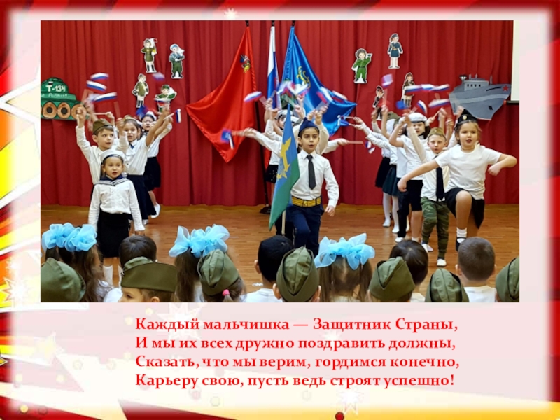 Каждый мальчишка — Защитник Страны, И мы их всех дружно поздравить должны, Сказать, что мы верим, гордимся