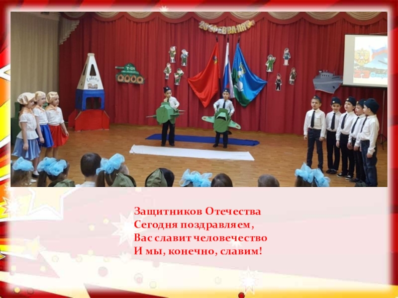 Слайд 12Защитников Отечества Сегодня поздравляем, Вас славит человечество И мы, конечно, славим!
