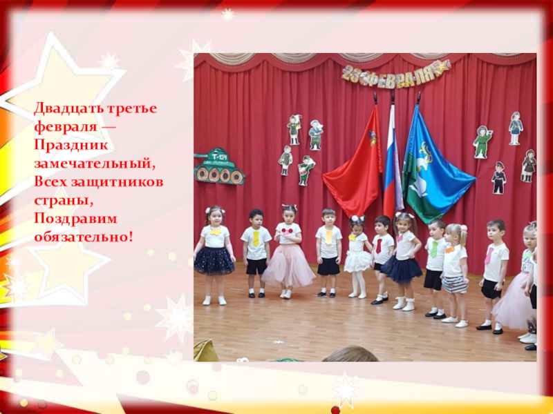 Слайд 14Двадцать третье февраля — Праздник замечательный, Всех защитников страны, Поздравим обязательно!