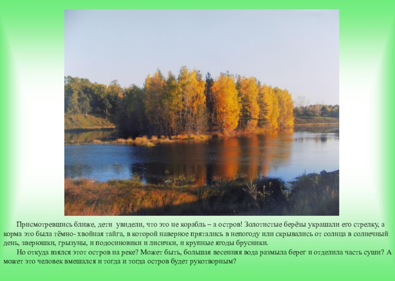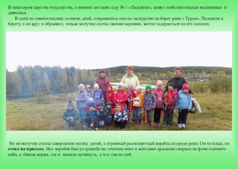Но не могучие сосны заворожили взгляд детей, а огромный разноцветный корабль посреди реки. Он не плыл, он стоял на приколе. Нос корабля был устремлён по течению вниз и жёлтыми красками сверкал на фоне осеннего неба, а тёмная корма, так и манила заглянуть, а что там на ней.