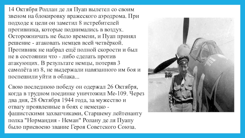 Свою последнюю победу он одержал 26 Октября, когда в трудном поединке уничтожил Ме-109. Через два дня, 28 Октября 1944 года, за мужество и отвагу проявленные в боях с немецко - фашистскими захватчиками, Старшему лейтенанту полка "Нормандия - Неман" Ролану де ля Пуапу было присвоено звание Героя Советского Союза.