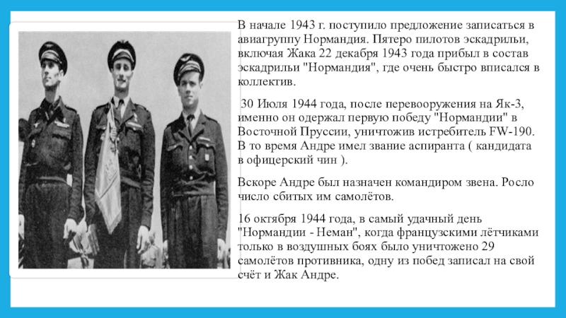 Слайд 14В начале 1943 г. поступило предложение записаться в авиагруппу Нормандия. Пятеро