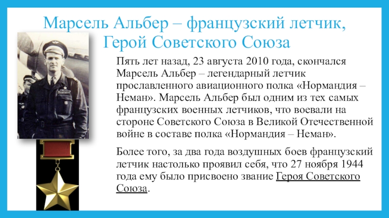 августа 2010 года, скончался Марсель Альбер – легендарный летчик прославленного авиационного полка «Нормандия – Неман». Марсель Альбер был одним из тех самых французских военных летчиков, что воевали на стороне Советского Союза в Великой Отечественной войне в составе полка «Нормандия – Неман».