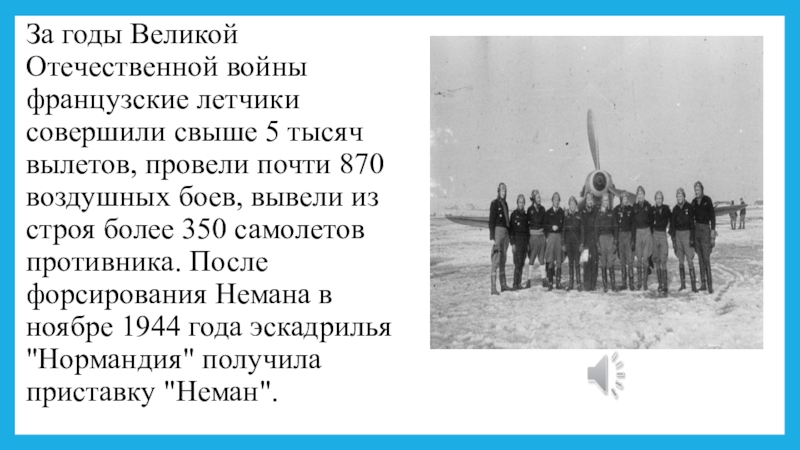 вылетов, провели почти 870 воздушных боев, вывели из строя более 350 самолетов противника. После форсирования Немана в ноябре 1944 года эскадрилья "Нормандия" получила приставку "Неман".