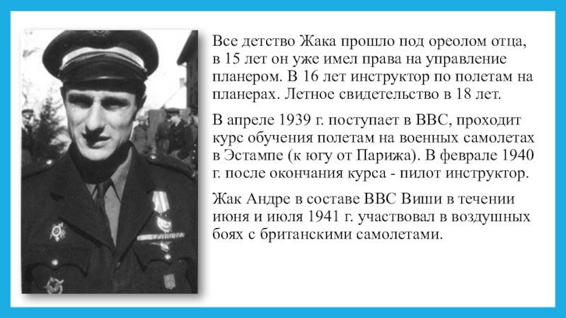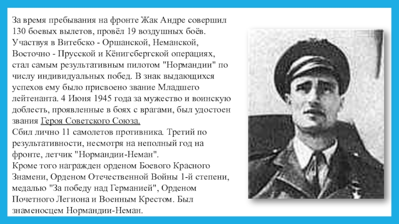 Слайд 15За время пребывания на фронте Жак Андре совершил 130 боевых вылетов,