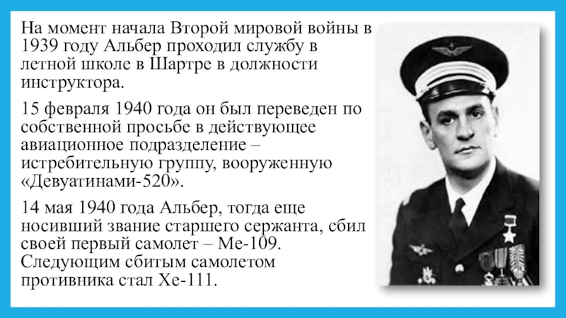 Слайд 19На момент начала Второй мировой войны в 1939 году Альбер проходил