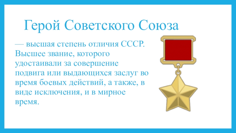 удостаивали за совершение подвига или выдающихся заслуг во время боевых действий, а также, в виде исключения, и в мирное время.