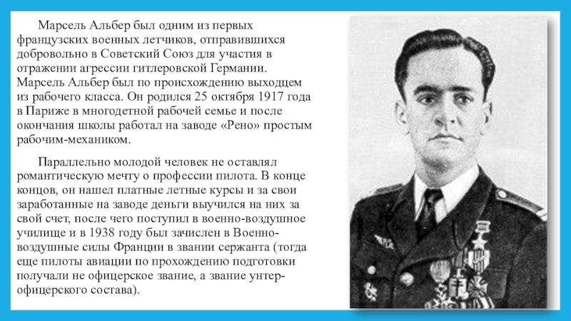 в Советский Союз для участия в отражении агрессии гитлеровской Германии. Марсель Альбер был по происхождению выходцем из рабочего класса. Он родился 25 октября 1917 года в Париже в многодетной рабочей семье и после окончания школы работал на заводе «Рено» простым рабочим-механиком.