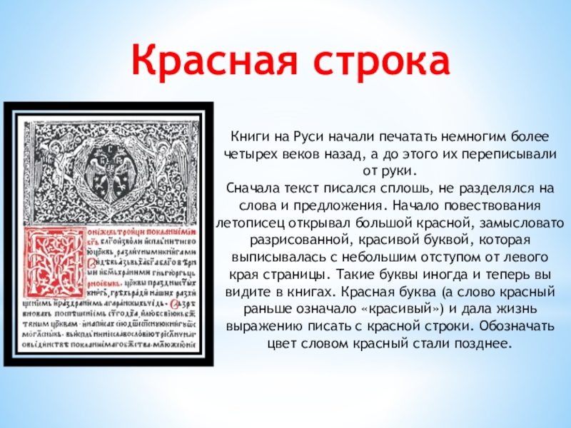Сначала текст писался сплошь, не разделялся на слова и предложения. Начало повествования летописец открывал большой красной, замысловато разрисованной, красивой буквой, которая выписывалась с небольшим отступом от левого края страницы. Такие буквы иногда и теперь вы видите в книгах. Красная буква (а слово красный раньше означало «красивый») и дала жизнь выражению писать с красной строки. Обозначать цвет словом красный стали позднее.