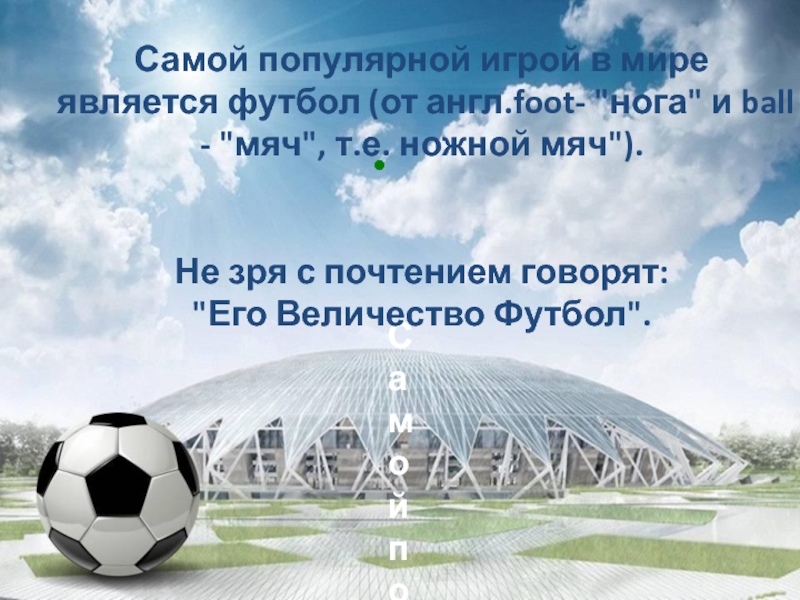 Самой популярной игрой в мире является футбол (от англ.foot- "нога" и ball - "мяч", т.е. ножной мяч").