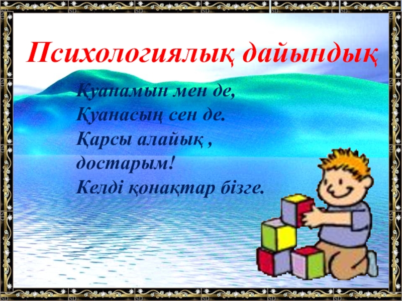 Психологиялық дайындықҚуанамын мен де,Қуанасың сен де.Қарсы алайық , достарым!Келді қонақтар бізге.