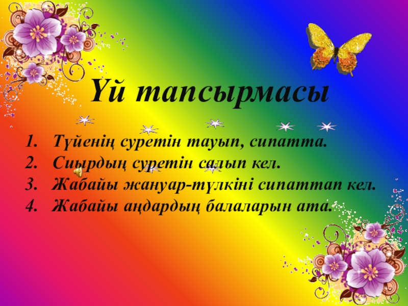 Үй тапсырмасыТүйенің суретін тауып, сипатта.Сиырдың суретін салып кел.Жабайы жануар-түлкіні сипаттап кел.Жабайы аңдардың балаларын ата.