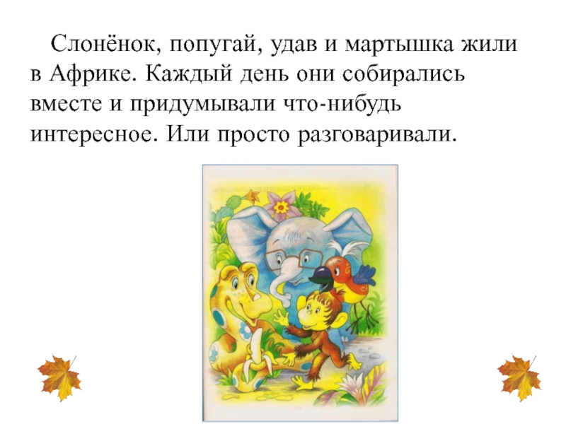 Слайд 4 Слонёнок, попугай, удав и мартышка жили в Африке. Каждый