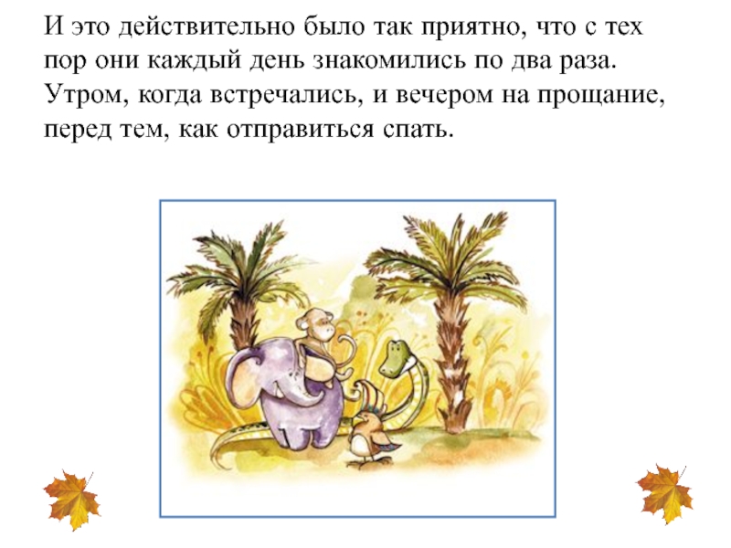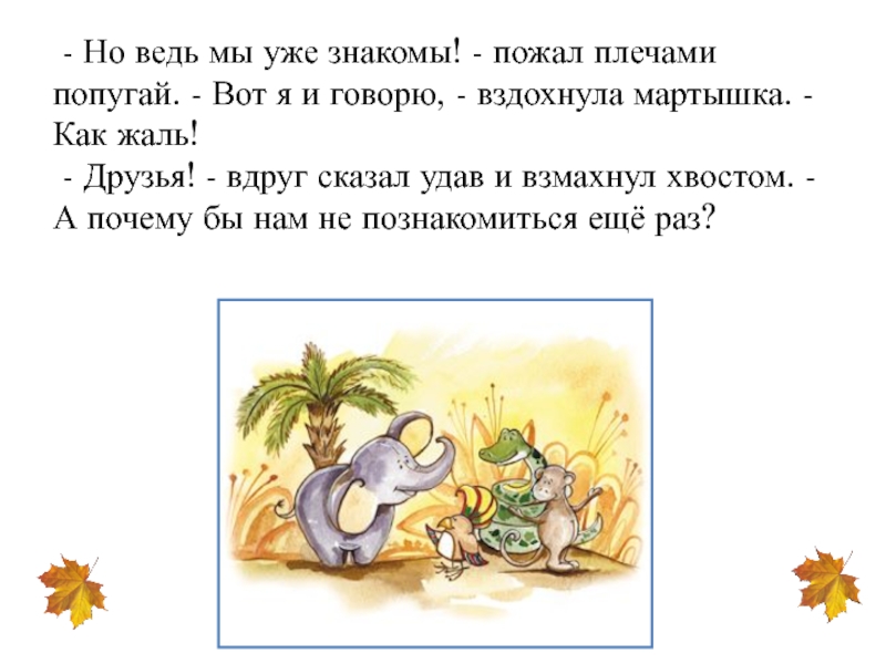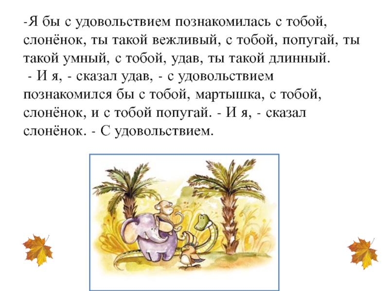 - И я, - сказал удав, - с удовольствием познакомился бы с тобой, мартышка, с тобой, слонёнок, и с тобой попугай. - И я, - сказал слонёнок. - С удовольствием.