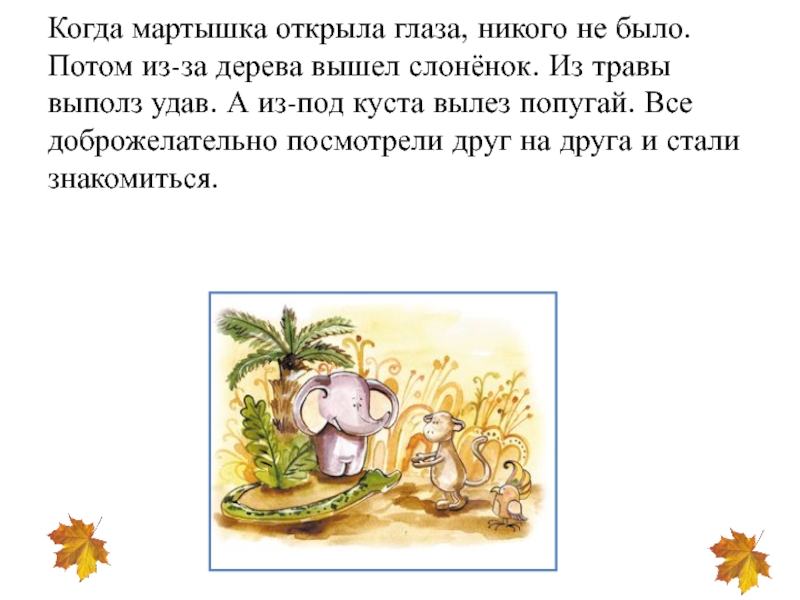 слонёнок. Из травы выполз удав. А из-под куста вылез попугай. Все доброжелательно посмотрели друг на друга и стали знакомиться.