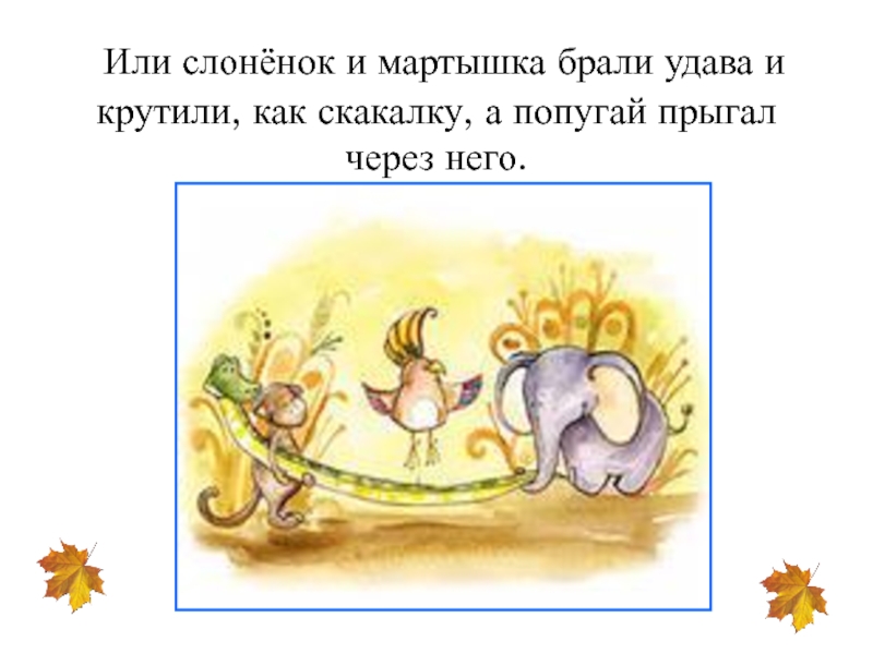 Слайд 7 Или слонёнок и мартышка брали удава и крутили, как скакалку, а