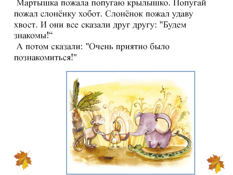 Слайд 15 Мартышка пожала попугаю крылышко. Попугай пожал слонёнку хобот. Слонёнок пожал