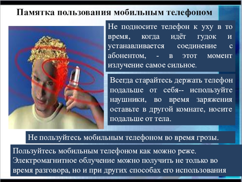 Пользуйтесь мобильным телефоном как можно реже. Электромагнитное облучение можно получить не только во время разговора, но и при других способах его использования