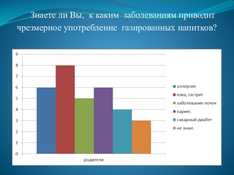 Слайд 9Знаете ли Вы, к каким заболеваниям приводит чрезмерное употребление газированных напитков?