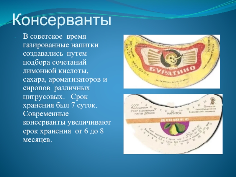 КонсервантыВ советское время газированные напитки создавались путем подбора сочетаний лимонной кислоты, сахара, ароматизаторов и сиропов различных цитрусовых. Срок хранения был 7 суток. Современные консерванты увеличивают срок хранения от 6 до 8 месяцев.