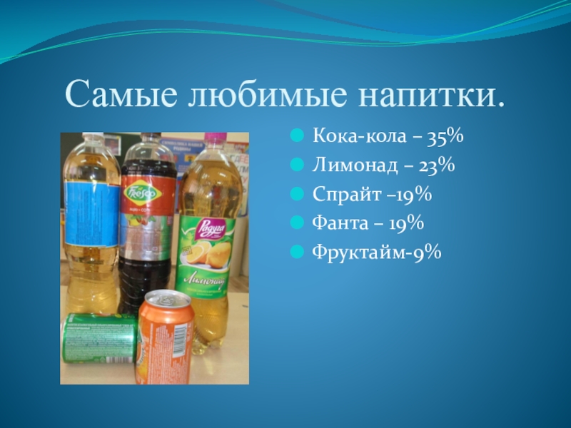 Самые любимые напитки.Кока-кола – 35%Лимонад – 23%Спрайт –19%Фанта – 19%Фруктайм-9%