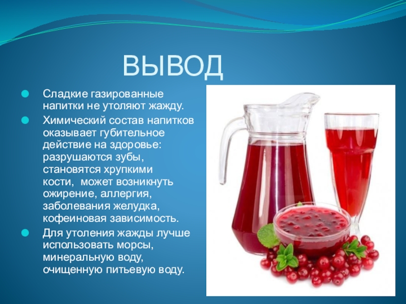 ВЫВОДСладкие газированные напитки не утоляют жажду.Химический состав напитков оказывает губительное