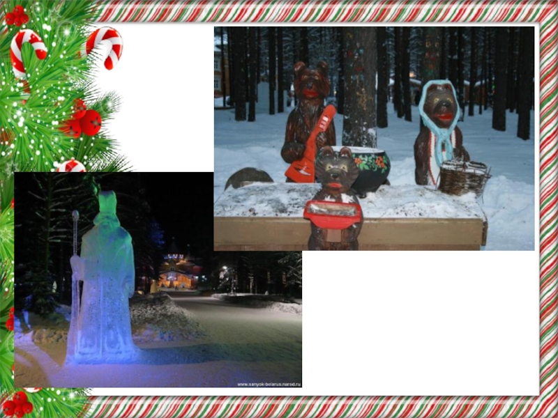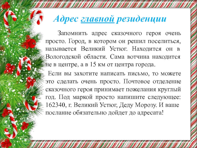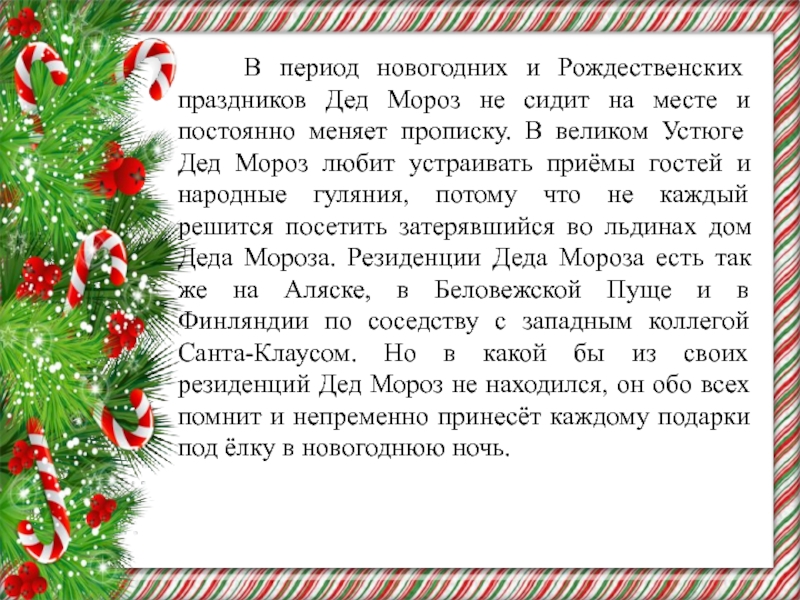 не сидит на месте и постоянно меняет прописку. В великом Устюге Дед Мороз любит устраивать приёмы гостей и народные гуляния, потому что не каждый решится посетить затерявшийся во льдинах дом Деда Мороза. Резиденции Деда Мороза есть так же на Аляске, в Беловежской Пуще и в Финляндии по соседству с западным коллегой Санта-Клаусом. Но в какой бы из своих резиденций Дед Мороз не находился, он обо всех помнит и непременно принесёт каждому подарки под ёлку в новогоднюю ночь.