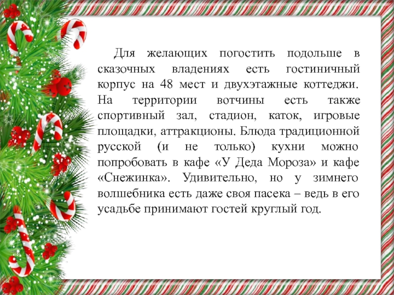 корпус на 48 мест и двухэтажные коттеджи. На территории вотчины есть также спортивный зал, стадион, каток, игровые площадки, аттракционы. Блюда традиционной русской (и не только) кухни можно попробовать в кафе «У Деда Мороза» и кафе «Снежинка». Удивительно, но у зимнего волшебника есть даже своя пасека – ведь в его усадьбе принимают гостей круглый год.
