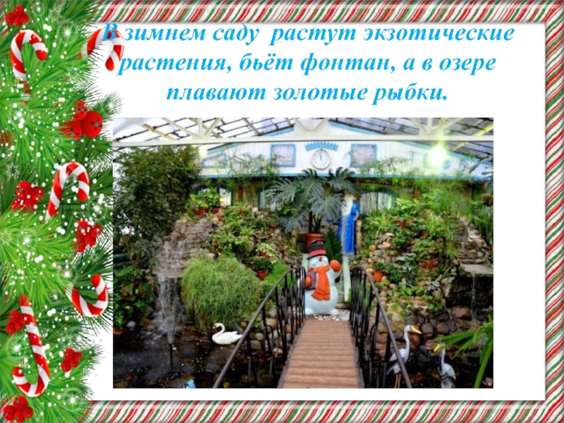 Слайд 23В зимнем саду растут экзотические растения, бьёт фонтан, а в озере