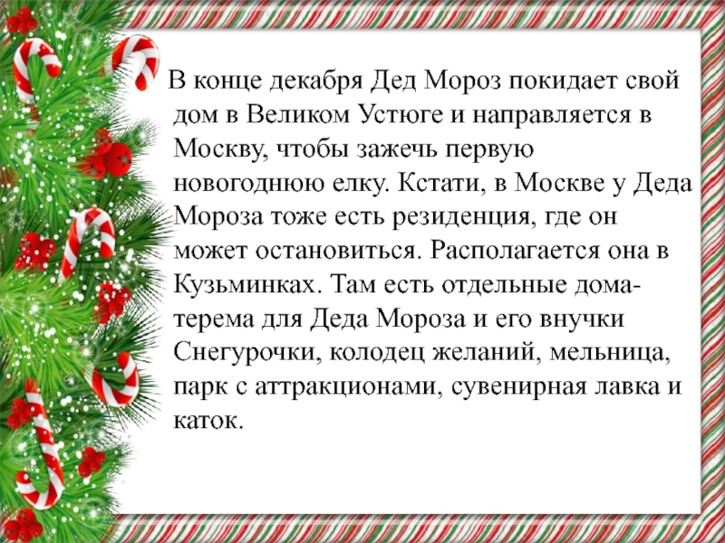 Великом Устюге и направляется в Москву, чтобы зажечь первую новогоднюю елку. Кстати, в Москве у Деда Мороза тоже есть резиденция, где он может остановиться. Располагается она в Кузьминках. Там есть отдельные дома-терема для Деда Мороза и его внучки Снегурочки, колодец желаний, мельница, парк с аттракционами, сувенирная лавка и каток.