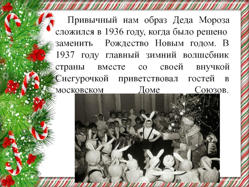 когда было решено заменить Рождество Новым годом. В 1937 году главный зимний волшебник страны вместе со своей внучкой Снегурочкой приветствовал гостей в московском Доме Союзов.