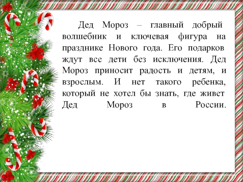 на празднике Нового года. Его подарков ждут все дети без исключения. Дед Мороз приносит радость и детям, и взрослым. И нет такого ребенка, который не хотел бы знать, где живет Дед Мороз в России.