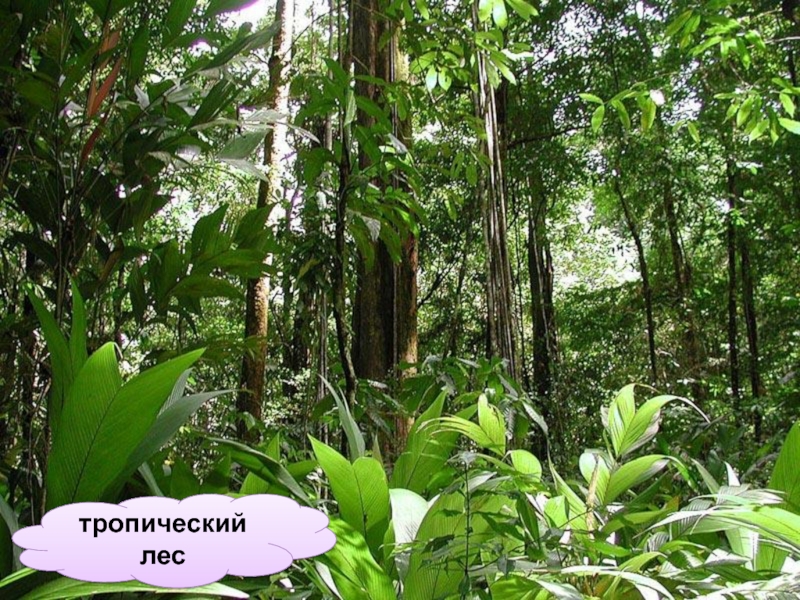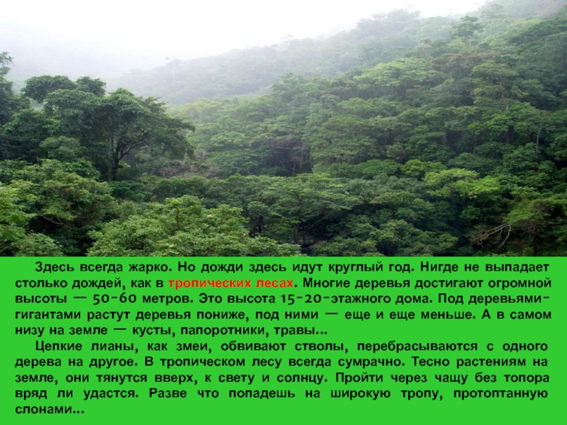 выпадает столько дождей, как в тропических лесах. Многие деревья достигают огромной высоты — 50-60 метров. Это высота 15-20-этажного дома. Под деревьями-гигантами растут деревья пониже, под ними — еще и еще меньше. А в самом низу на земле — кусты, папоротники, травы...