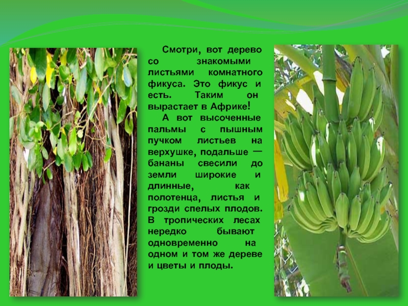 Смотри, вот дерево со знакомыми листьями комнатного фикуса. Это фикус и