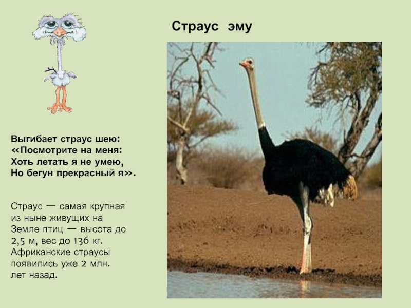 — высота до 2,5 м, вес до 136 кг. Африканские страусы появились уже 2 млн. лет назад.