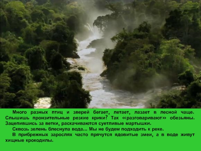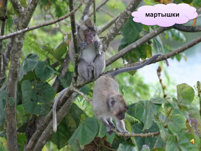 Слышишь пронзительные резкие крики? Так «разговаривают» обезьяны. Зацепившись за ветки, раскачиваются суетливые мартышки.