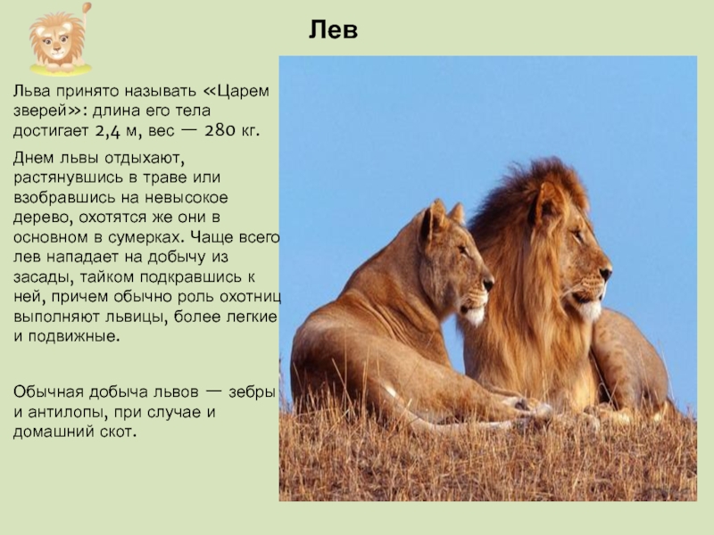 Слайд 40Льва принято называть «Царем зверей»: длина его тела достигает 2,4 м,