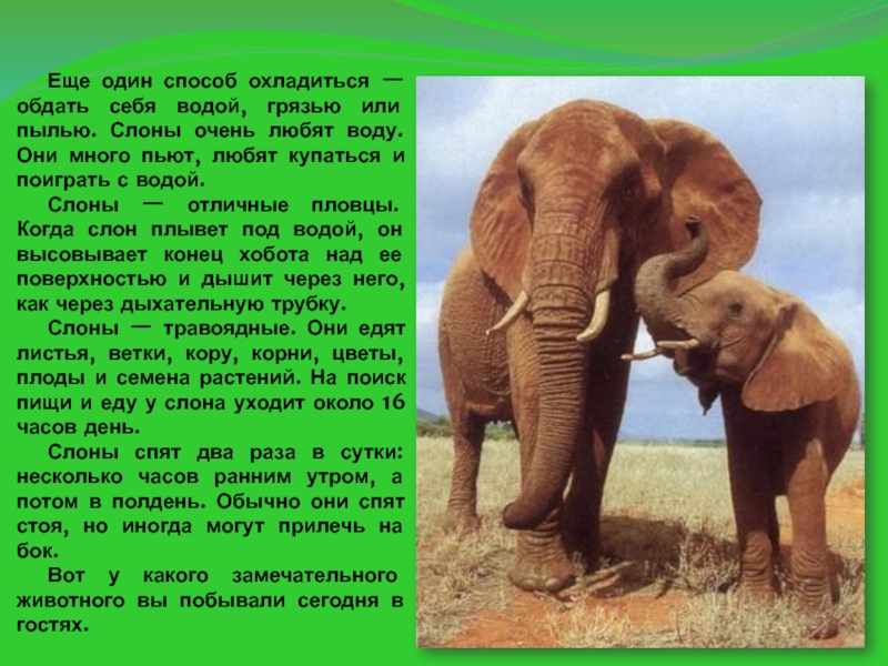 Слоны очень любят воду. Они много пьют, любят купаться и поиграть с водой.
