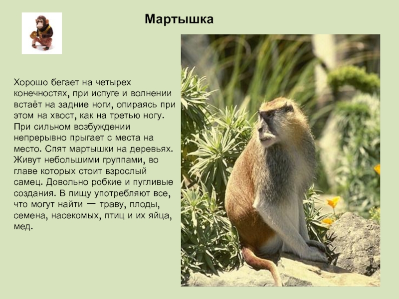 задние ноги, опираясь при этом на хвост, как на третью ногу. При сильном возбуждении непрерывно прыгает с места на место. Спят мартышки на деревьях. Живут небольшими группами, во главе которых стоит взрослый самец. Довольно робкие и пугливые создания. В пищу употребляют все, что могут найти — траву, плоды, семена, насекомых, птиц и их яйца, мед.