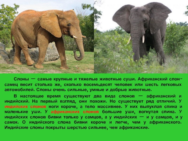 В настоящее время существуют два вида слонов — африканский и индийский. На первый взгляд, они похожи. Но существует ряд отличий. У индийских слонов ноги короче, а тело массивнее. У них выпуклая спина и маленькие уши. У африканских слонов большие уши, вогнутая спина. У индийских слонов бивни только у самцов, а у индийских — и у самцов, и у самок. О индийского слона бивни короче и легче, чем у африканского. Индийские слоны покрыты шерстью сильнее, чем африканские.
