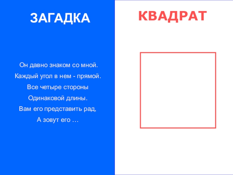 ЗАГАДКА Он давно знаком со мной.Каждый угол в нем - прямой.Все четыре стороныОдинаковой длины.Вам его представить рад,А