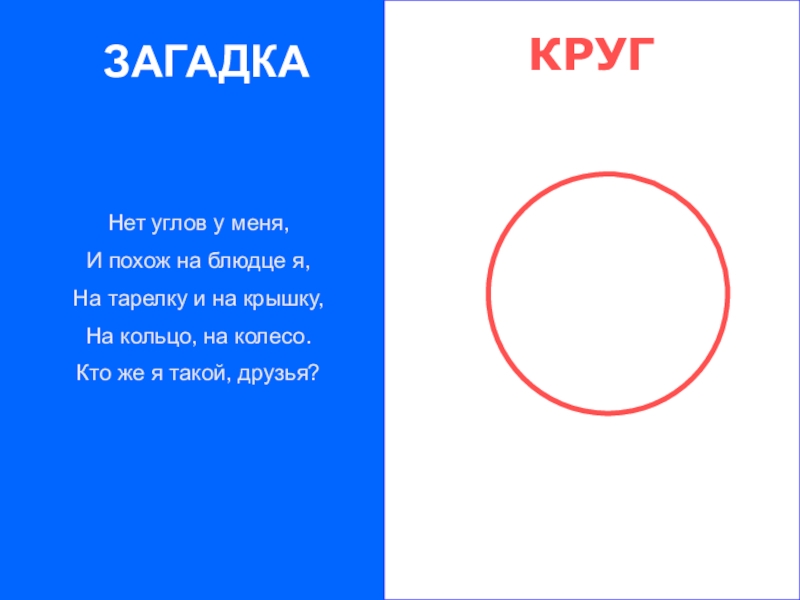 ЗАГАДКАНет углов у меня,И похож на блюдце я,На тарелку и на крышку,На кольцо, на колесо.Кто же я