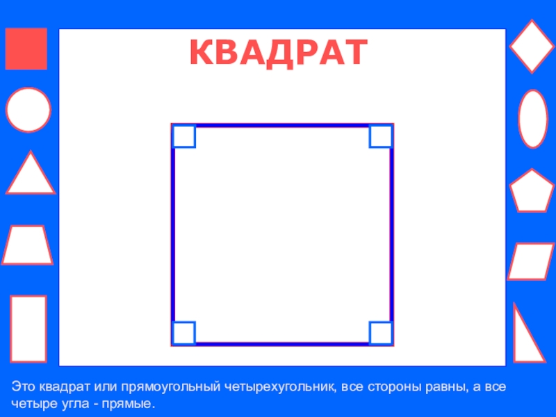 КВАДРАТЭто квадрат или прямоугольный четырехугольник, все стороны равны, а все четыре угла - прямые.